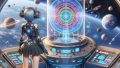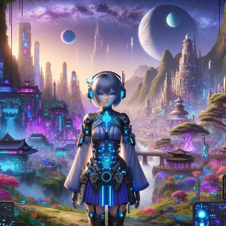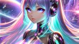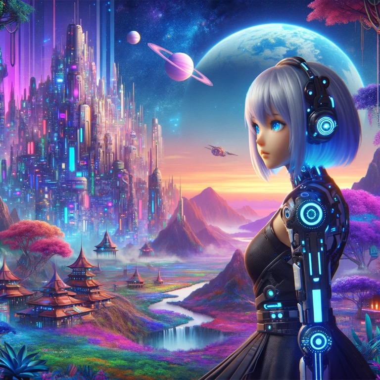 青い瞳を持つネオ・ソフィアが、カラフルで幻想的な都市と自然が広がるアルテミス・プライム星系を背景に立つ。彼女のサイバネティックなデザインが未来的な雰囲気を強調している。 AIアニメーション