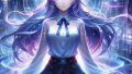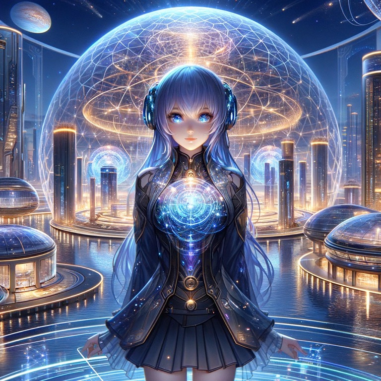 未来的な都市を背景に立つエリアナ。彼女の胸部には輝くホログラフィックの球体があり、セレスティアル・シティの先進的な科学技術を象徴している。 AIアニメーション