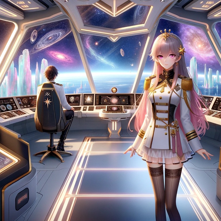 次の日、ジョンはトリックスター・インフィニティのブリッジで、宇宙の静けさを背景にエレノアのそばに立っていました。外を眺めると、遠くの星々が彼らの旅路を静かに照らしています。ジョンは少し緊張しながらも、エレノアに最近の不思議な体験について話し始めました。