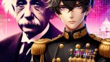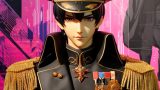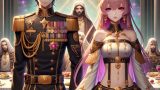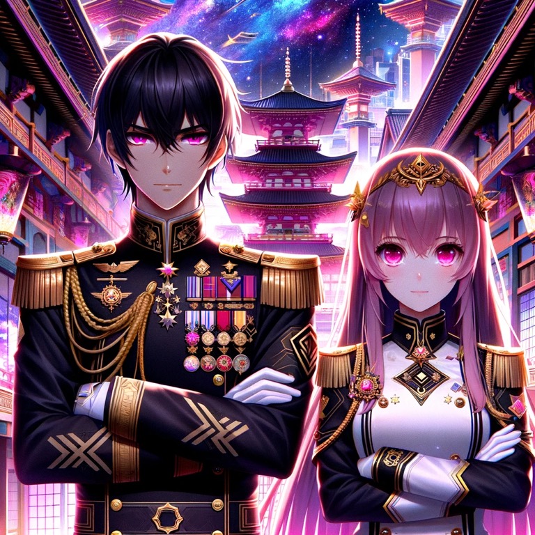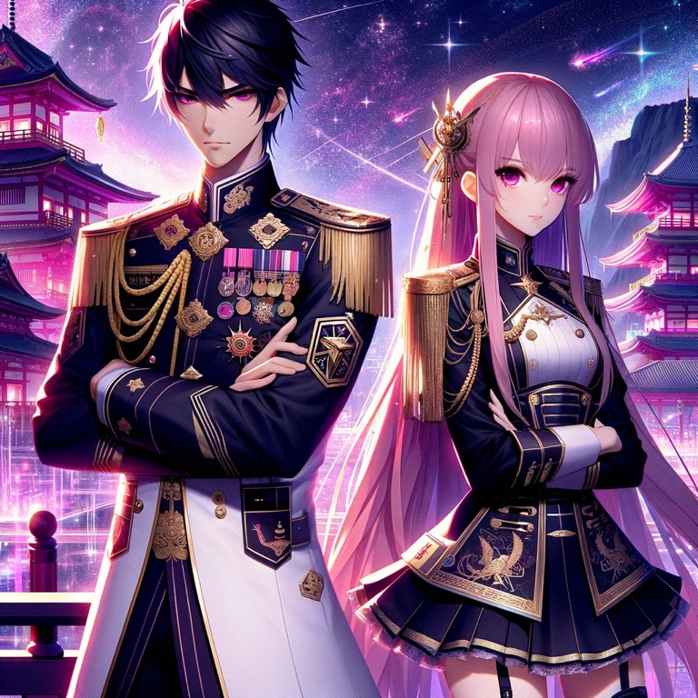 幻想的な和風未来都市を背景に、軍服をまとったエレノアとジョンが並び立つ。 未分類